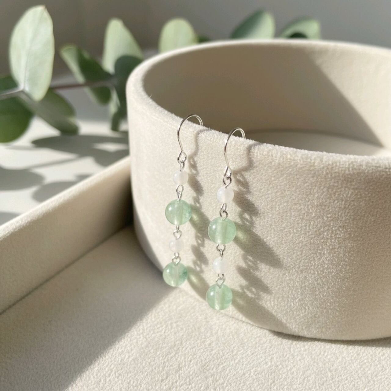 透明感あふれるグリーンフローライトと、やわらかな光を放つホワイトムーンストーンを組み合わせた、ナチュラルで上品な雰囲気のハンドメイドピアスです。