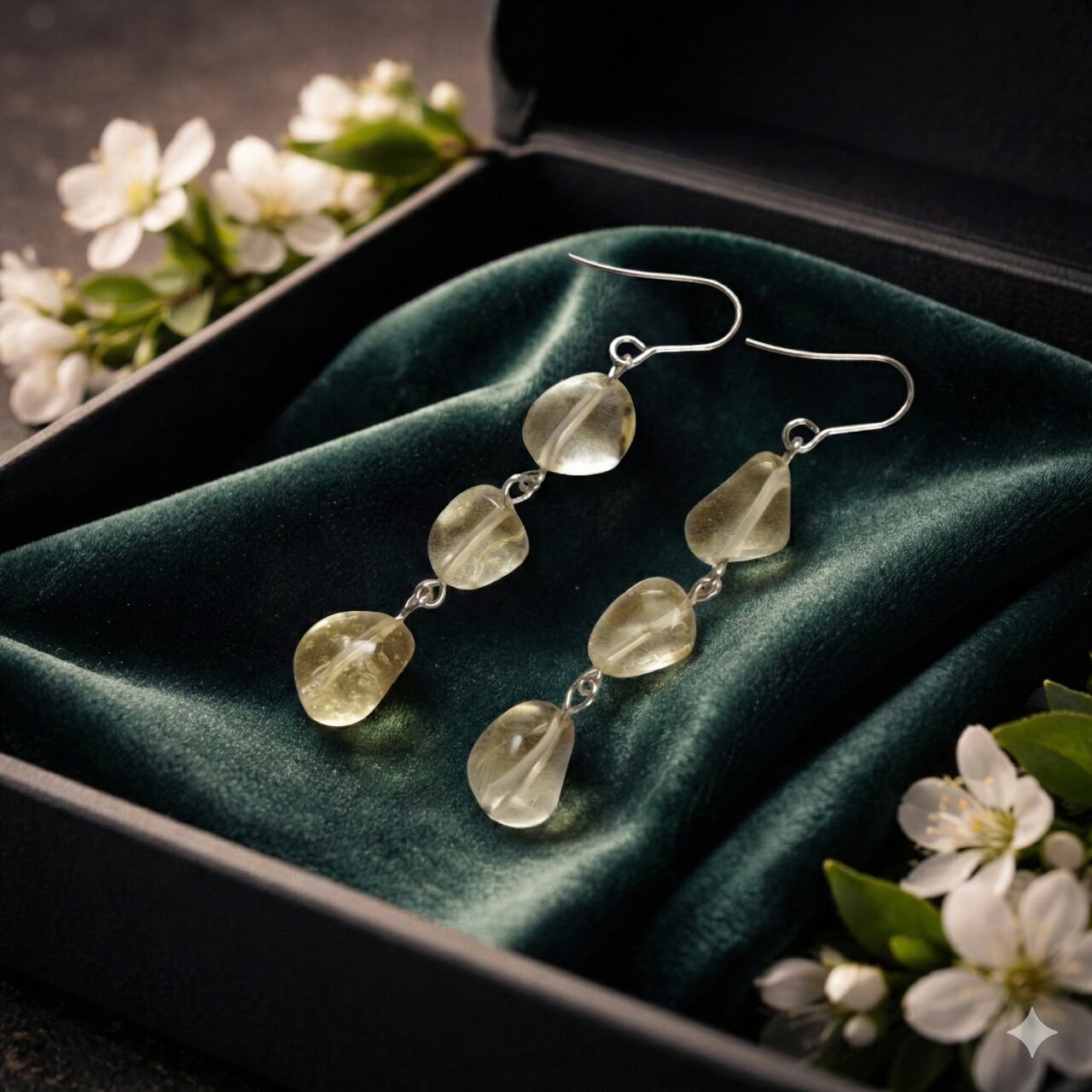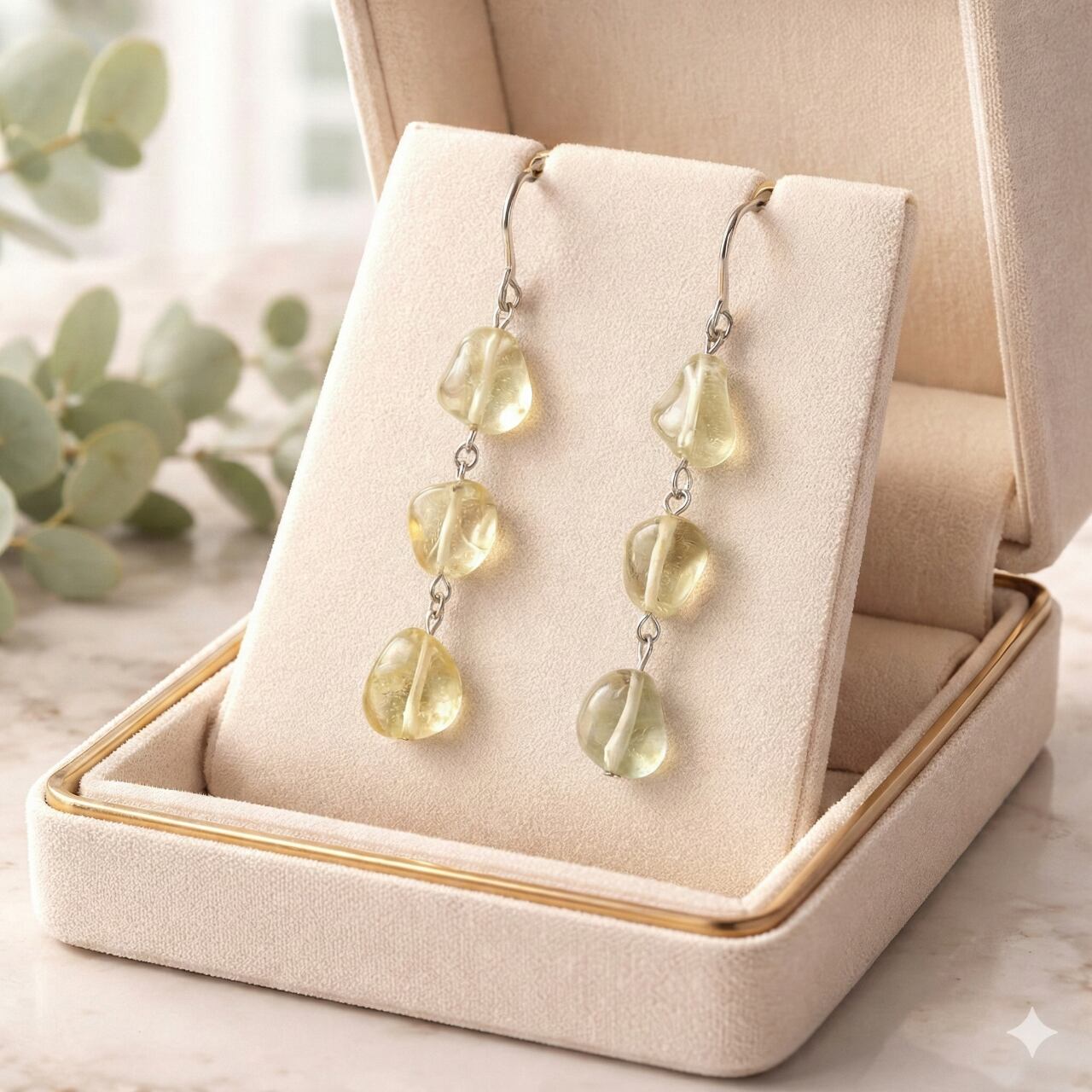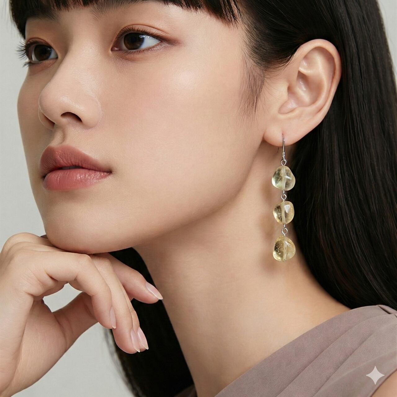 縦に連なるレモンクォーツの揺れ感が顔まわりをすっきりと見せ、大人のきれいめスタイルに自然に溶け込みます。