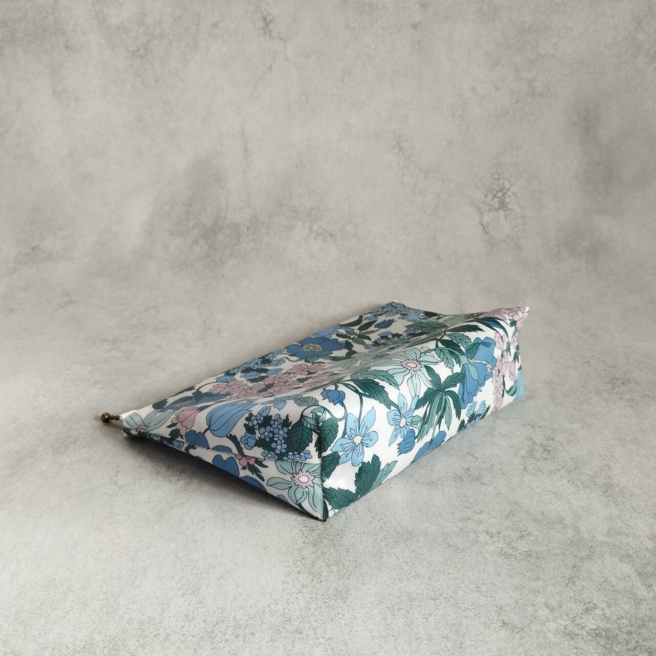 リバティのラミネート生地、クララベル(Clarabelle)を使用した、上品で機能的なマチ付きポーチです。